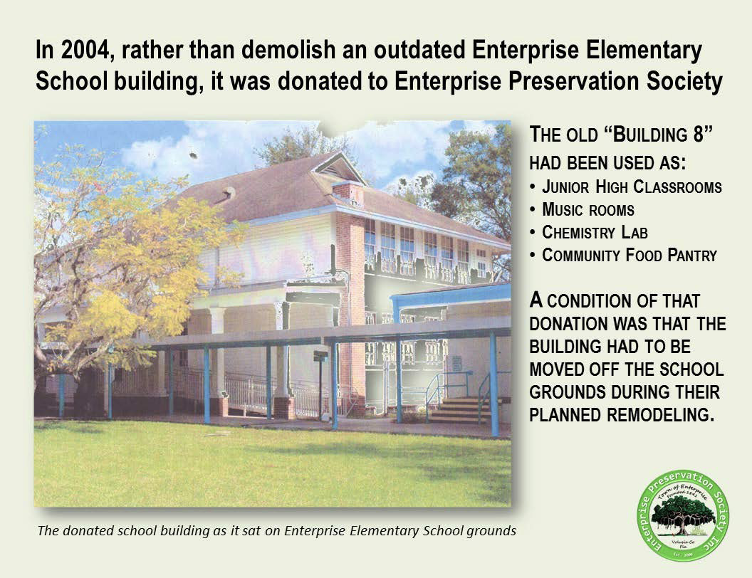 With the Thornby house destroyed, hope for a community museum went up in smoke, too. But then fate stepped in. With skyrocketing enrollment at Enterprise Elementary School, the School Board faced a dilemma. Expansion plans were thwarted by Building 8. Originally built in 1936, it was now squeezed in and surrounded by other campus buildings. Because it was not suited for renovation, it would have to go -- but the Board was reluctant to demolish the historic building. Enter the Enterprise Preservation Society, its dreams of a museum resurrected when the building was offered for FREE.